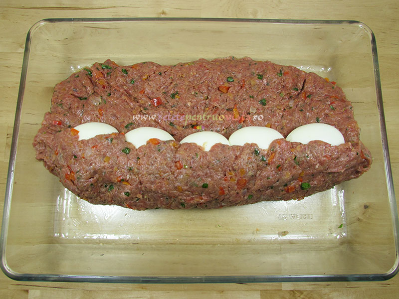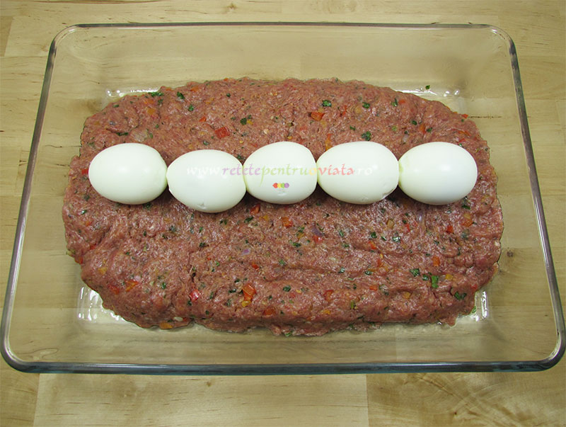 7. Ungem o tava incapatoare cu ulei si intindem compozitia de carne tocata intr-un strat oval, presand foarte bine cu mana. Punem ouale fierte in centrul compozitiei, lipite unul de altul.