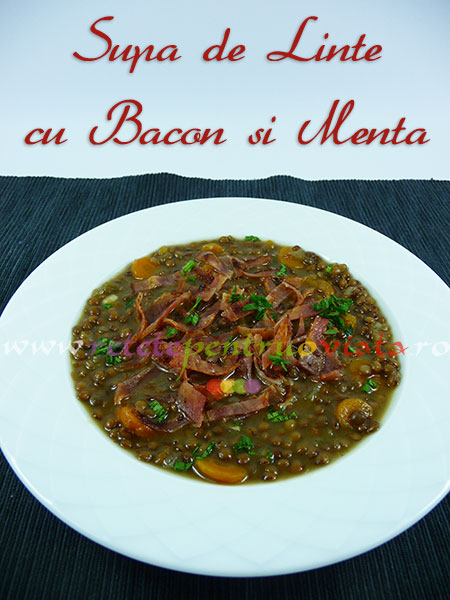 Reteta de supa de linte cu bacon si menta se pregateste usor, in acelasi mod ca reteta clasica de supa de linte, doar ca nu punem rosii. Ii adaugam la sfarsit bacon rumenit in tigaie, fara ulei, sau orice alt fel de afumatura avem (costita afumata, jambon).
