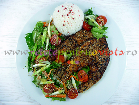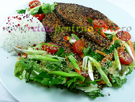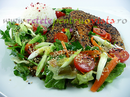 Reteta de somon cu crusta de susan are un gust extraordinar, iar salata care il insoteste are un dressing special, cu un gust dulce-acrisor si arome deosebite care se imbina perfect cu gustul somonului.